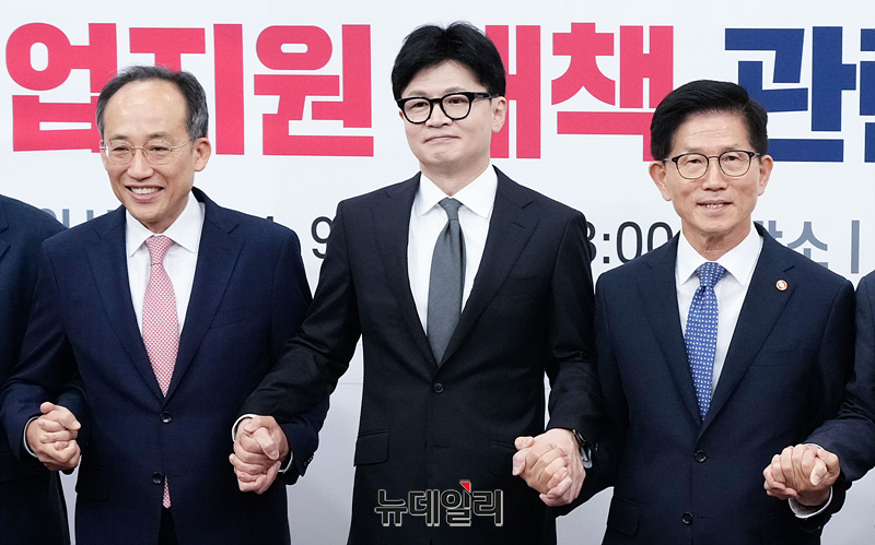 한동훈 국민의힘 대표, 추경호 원내대표, 김문수 고용노동부 장관을 비롯한 참석자들이 24일 오전 서울 여의도 국회에서 열린 청년 취업지원 대책 관련 당정협의회에서 기념촬영을 하고 있다.