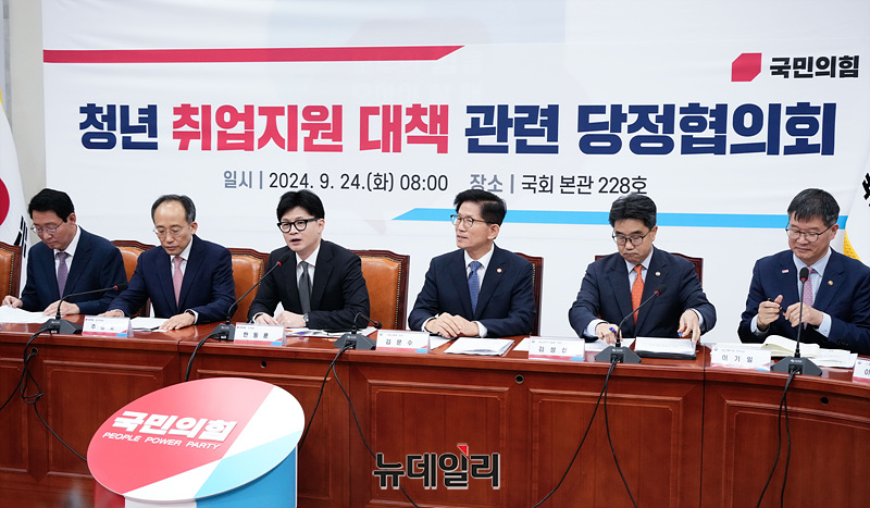 한동훈 국민의힘 대표가 24일 오전 서울 여의도 국회에서 열린 청년 취업지원 대책 관련 당정협의회에서 모두발언을 하고 있다.