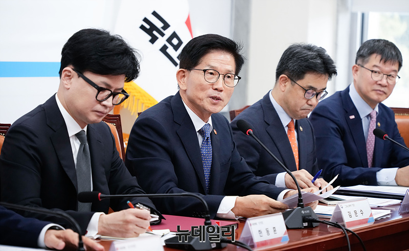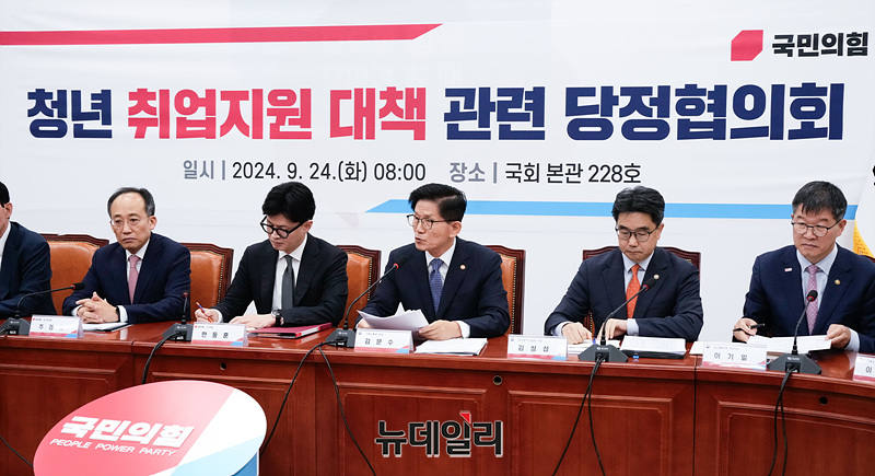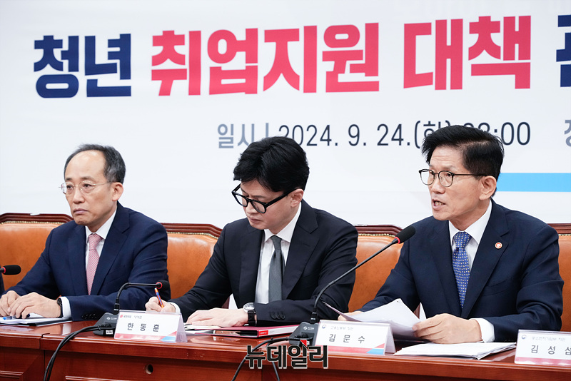 김문수 고용노동부 장관이 24일 오전 서울 여의도 국회에서 열린 청년 취업지원 대책 관련 당정협의회에서 모두발언을 하고 있다.