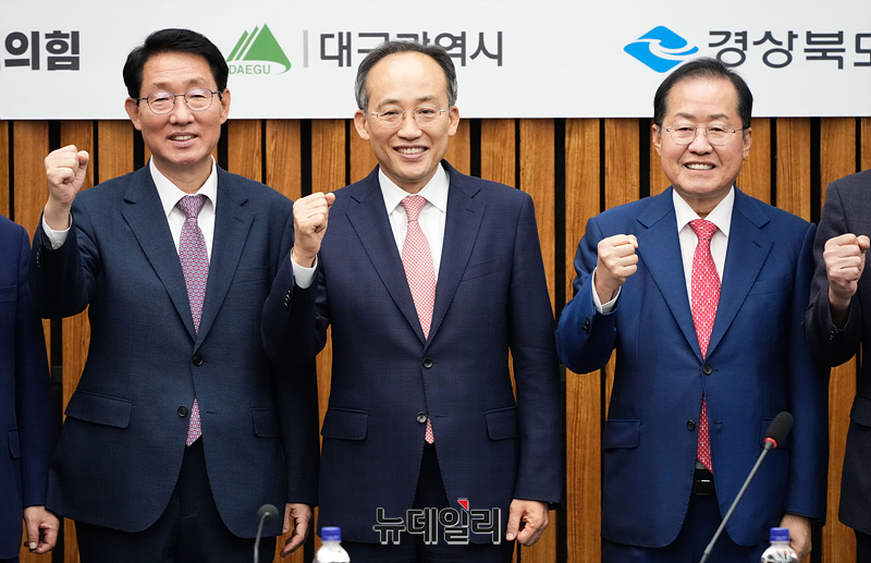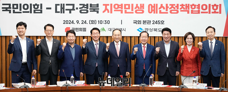 추경호 국민의힘 원내대표와 홍준표 대구광역시장이 24일 오전 서울 여의도 국회에서 열린 대구·경북 지역 민생 예산정책협의회에서 기념촬영을 하고 있다.