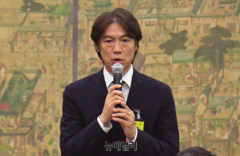 홍명보 대한민국 축구대표팀 감독이 24일 국회에서 열린 문화체육관광위원회의 대한축구협회 등에 대한 현안질의에서 의원 질문에 답하고 있다.