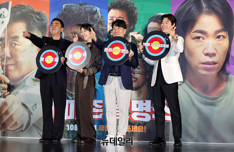 배우 류승룡, 진선규, 염혜란이 24일 오전 서울 광진구 롯데시네마 건대입구점에서 열린 영화 '아마존 활명수(감독 김창주)' 제작보고회에서 포즈를 취하고 있다.'아마존 활명수'는 집에서도 회사에서도 구조조정 대상인 전 양궁 국가대표 진봉(류승룡)이 한국계 볼레도르인 통역사 빵식(진선규)과 신이 내린 활 솜씨의 아마존 전사 3인방을 만나 벌어지는 이야기를 담은 코믹 활극이다.배우 류승룡, 진선규, 염혜란, 고경표 등이 출연한다. 10월 30일 극장 개봉.