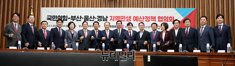 추경호 국민의힘 원내대표와 박형준 부산시장을 비롯한 참석자들이 24일 오후 서울 여의도 국회에서 열린 부산·울산·경남 지역민생 예산정책 협의회에서 기념촬영을 하고 있다.