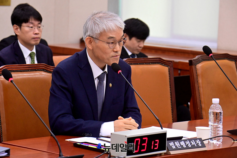 천대엽 법원행정처장이 25일 오전 국회에서 열린 국회 법제사법위원회 전체회의에서 의원들의 질문에 답변하고 있다.