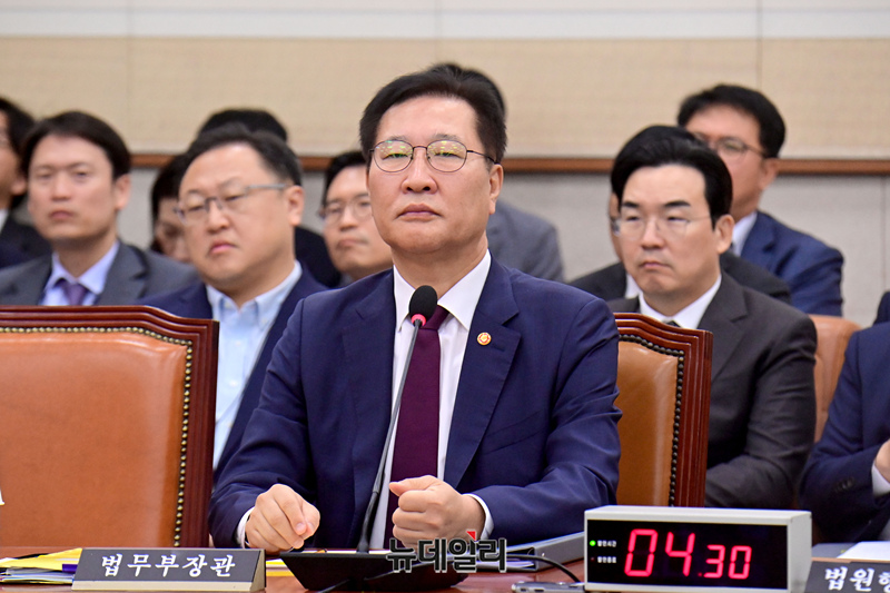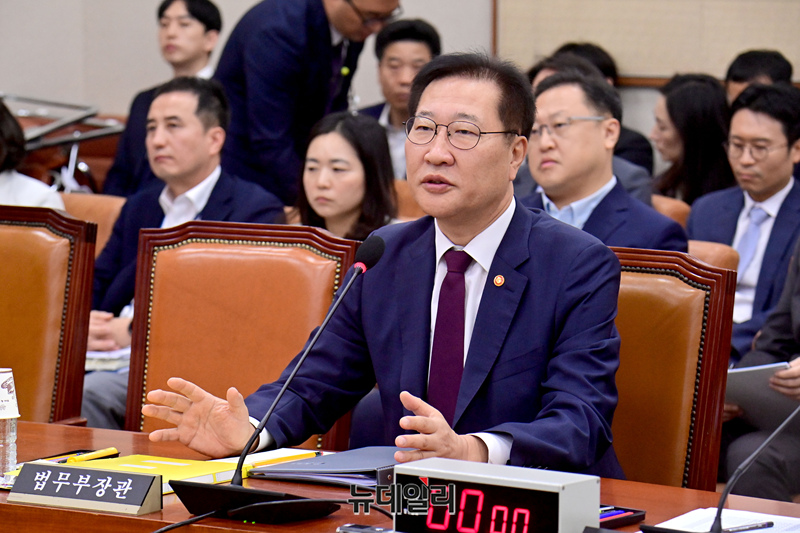 박성재 법무부 장관이 25일 오전 국회에서 열린 국회 법제사법위원회 전체회의에서 의원들의 질문에 답변하고 있다.