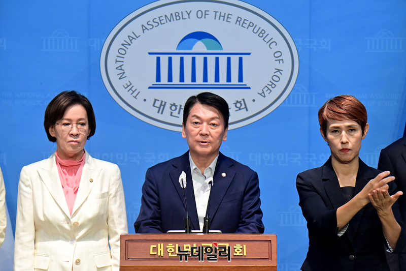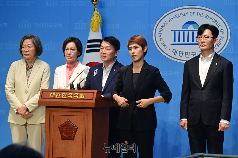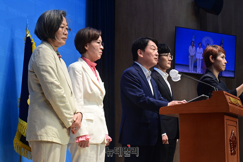 안철수 국민의힘 딥페이크 디지털 성범죄 대응 특별위원회 위원장 및 소속 의원들이 25일 오전 국회 소통관에서 딥페이크 근절 대책을 발표하고 있다.