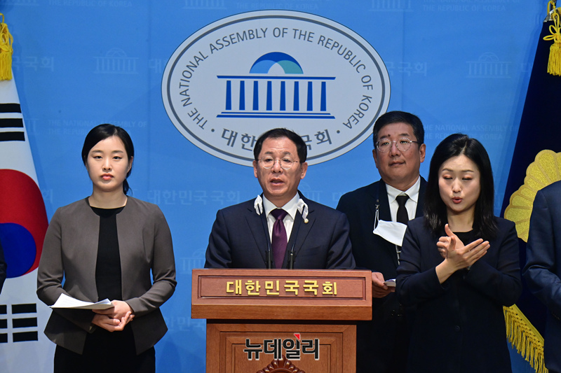 이상휘 국민의힘 미디어특위 위원장이 26일 오전 국회 소통관에서 열린 '방심위 민원인 불법사찰 피해자 법률대리인 기자회견'에서 발언을 하고 있다.