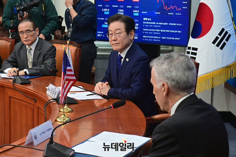이재명 더불어민주당 대표가 26일 오전 국회에서 필립 골드버그 주한미국대사를 접견하고 환담을 나누고 있다.