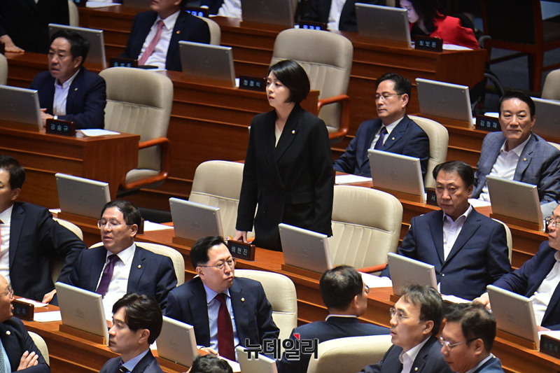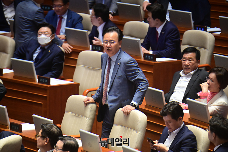국민의힘 의원들이 26일 국회에서 열린 본회의에서 한석훈 국가인권위원회 위원 선출안이 부결된 것에 대해 항의하고 있다. 이날 더불어민주당이 인권위원으로 추천한 이숙진 전 여성가족부 차관은 찬성 281표, 반대 14표, 기권 3표로 선출됐다.