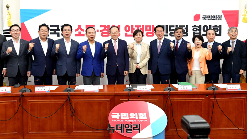 추경호 국민의힘 원내대표, 송미령 농림축산식품부 장관 등 참석자들이 27일 오전 국회에서 열린 한국형 소득·경영 안전망 민당정 협의회에서 기념촬영을 하고 있다.