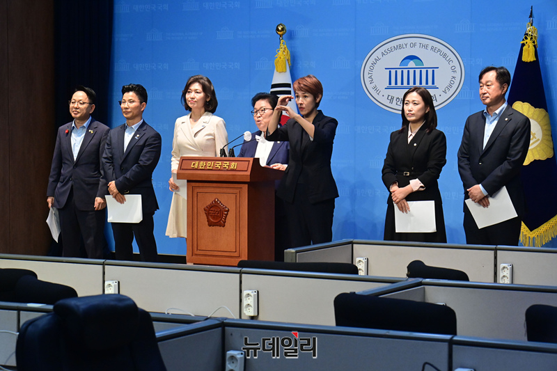문정복 교육위원회 더불어민주당 간사를 및 야당 위원들이 27일 오후 국회 소통관에서 열린 검정 역사 교과서 검정 취소 관련 기자회견에서 한국학력평가원 검정 역사교과서를 철회하라고 촉구하고 있다.