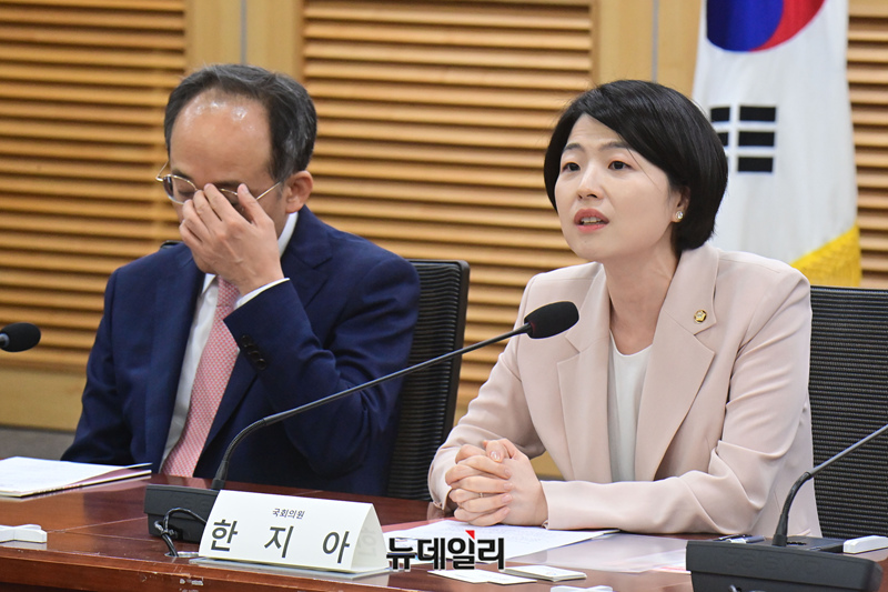 한지아 국민의힘 의원이 27일 오후 국회 의원회관에서 열린 희귀·중증난치질환 필수의료 지원 방안 토론회에서 인사말을 하고 있다.