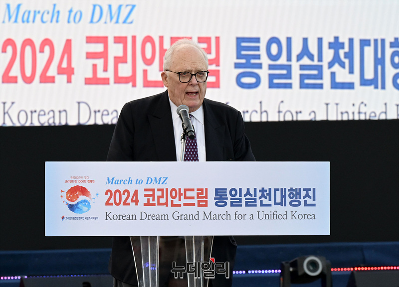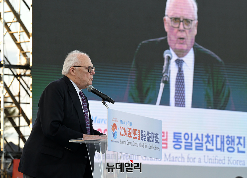 에드윈 퓰너 헤리티지재단 설립자가 28일 경기도 파주시 임진각 평화누리공원에서 열린 '2024 코리안드림 통일실천대행진'에서 축사를 하고 있다. (사진=공동취재단)