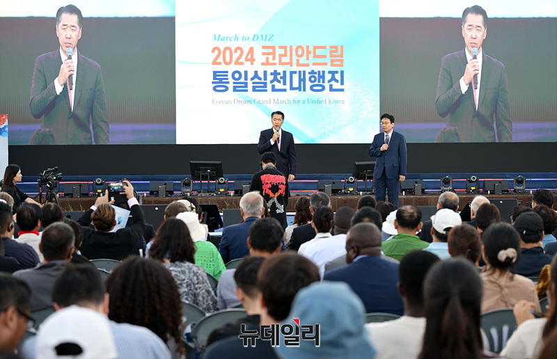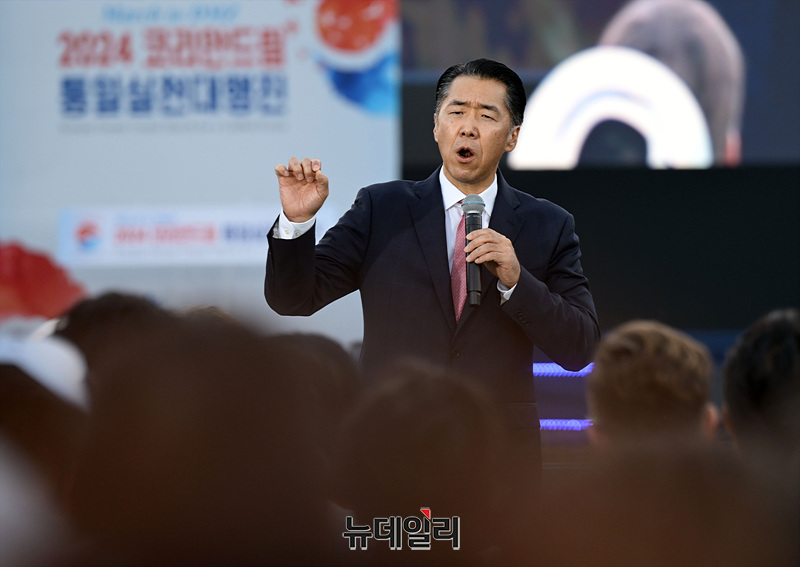 문현진 GPF 재단 이사장이 28일 경기도 파주시 임진각 평화누리공원에서 열린 '2024 코리안드림 통일실천대행진'에서 기조연설을 하고 있다. (사진=공동취재단)