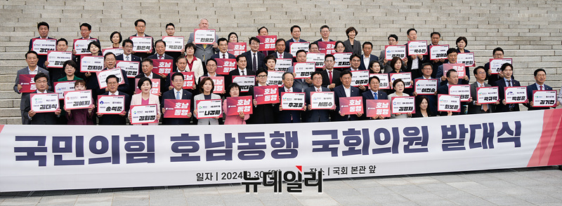 한동훈 국민의힘 대표, 추경호 원내대표를 비롯한 의원들이 30일 오전 서울 여의도 국회에서 열린 호남동행 특별위원회 발대식에서 기념촬영을 하고 있다.
