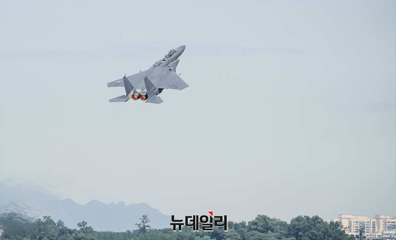 대한민국 공군 F-15K 전투기가 25일 오전 경기 성남시 서울공항에서 열린 제 76주년 국군의 날 기념식 미디어데이에서 불을 뿜으며 이륙하고 있다. (경기 성남=서성진 기자)