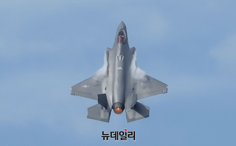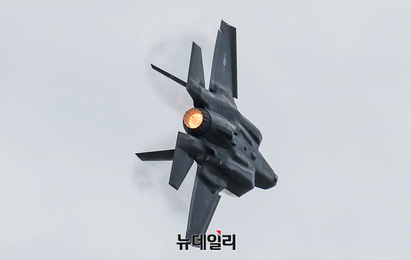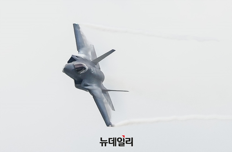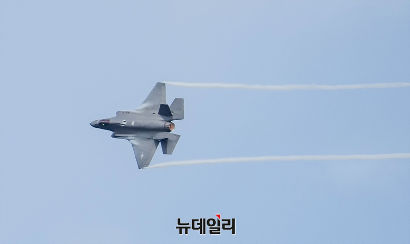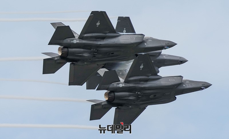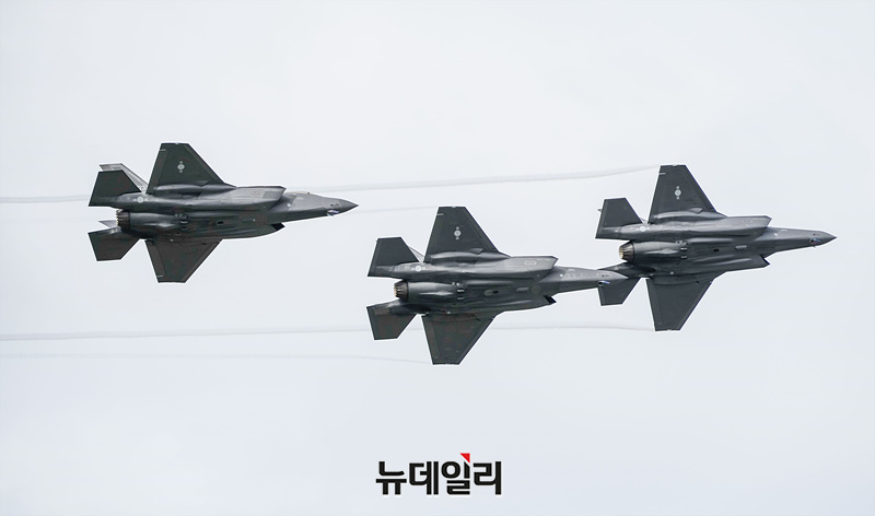대한민국 공군 F-35A 스텔스 전투기가 25일 오전 경기 성남시 서울공항에서 열린 제 76주년 국군의 날 기념식 미디어데이에서 편대비행을 선보이고 있다. (경기 성남=서성진 기자)