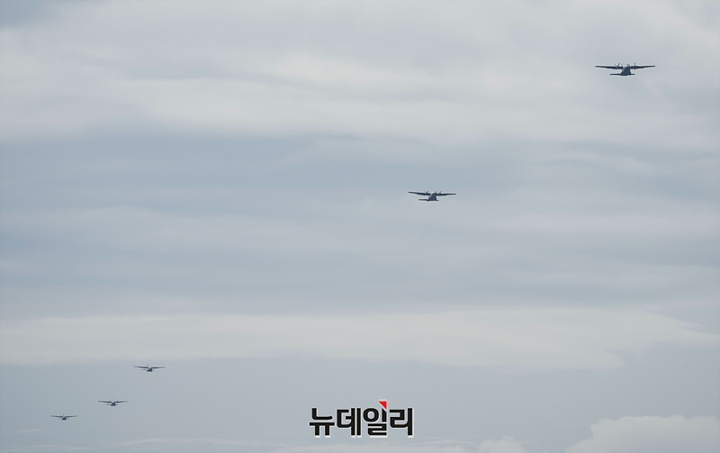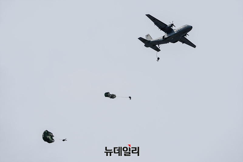 대한민국 육군 특전사 대원들이 25일 오전 경기 성남시 서울공항에서 열린 제 76주년 국군의 날 기념식 미디어데이에서 고공강하를 선보이고 있다. (경기 성남=서성진 기자)
