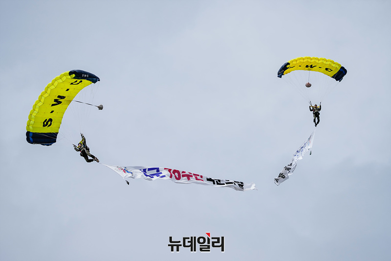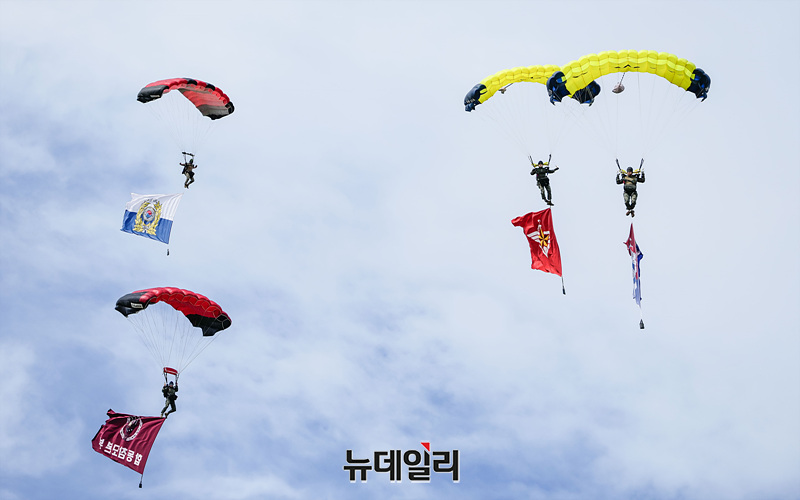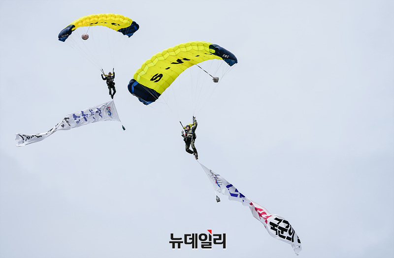 대한민국 육군 특전사 대원들이 25일 오전 경기 성남시 서울공항에서 열린 제 76주년 국군의 날 기념식 미디어데이에서 고공강하를 선보이고 있다. (경기 성남=서성진 기자)