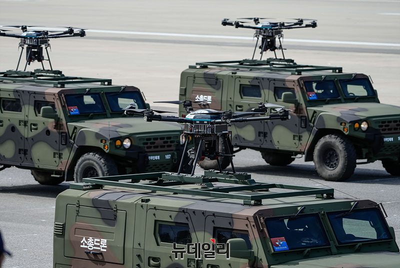 군단 UAV-II, MUAV, 소형 드론 등 각군이 운용하고 개발 중인 무인체계로 구성된 장비부대가 25일 오전 경기 성남시 서울공항에서 열린 제 76주년 국군의 날 기념식 미디어데이에서 분열하고 있다. (경기 성남=서성진 기자)