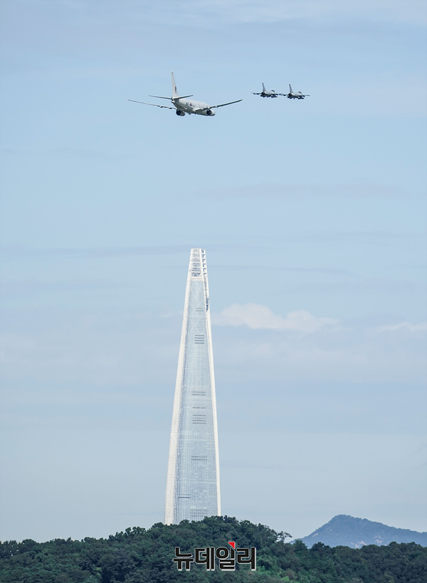 대한민국 해군 P-8 포세이돈 해상초계기와 공군 KF-16 전투기가 25일 오전 경기 성남시 서울공항에서 열린 제 76주년 국군의 날 기념식 미디어데이에서 편대비행을 선보이고 있다. (경기 성남=서성진 기자)
