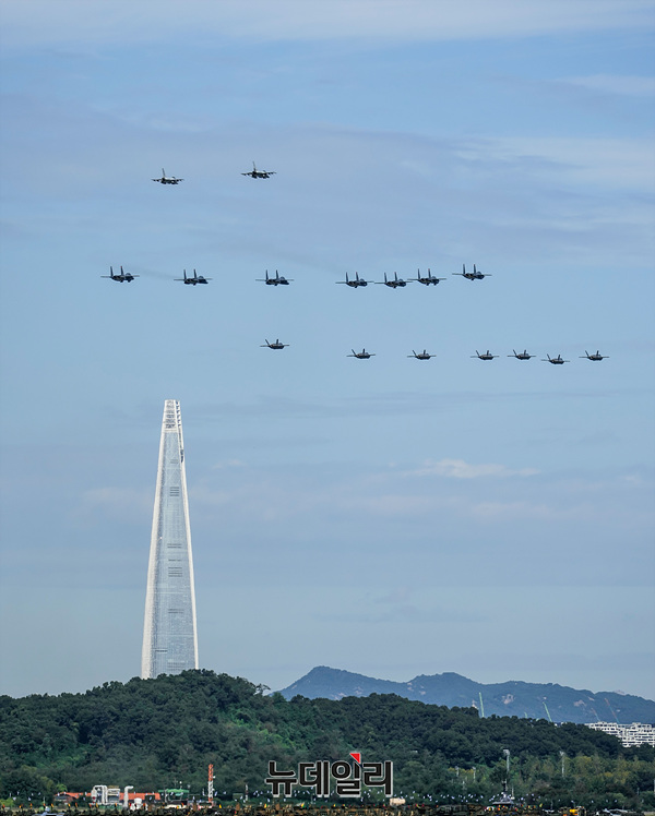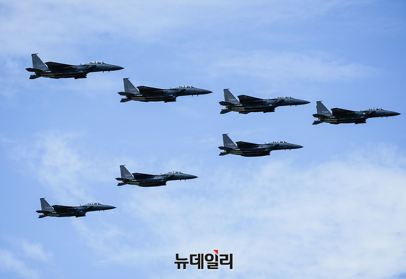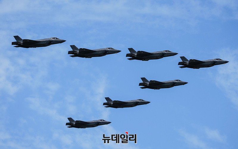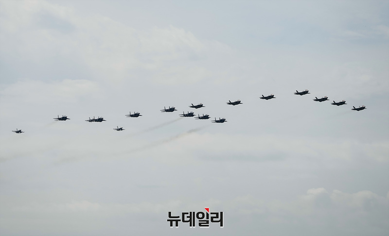 대한민국 공군 KF-16, F-15K, F-5, F-35A 전투기 편대가 25일 오전 경기 성남시 서울공항에서 열린 제 76주년 국군의 날 기념식 미디어데이에서 편대비행을 선보이고 있다. (경기 성남=서성진 기자)