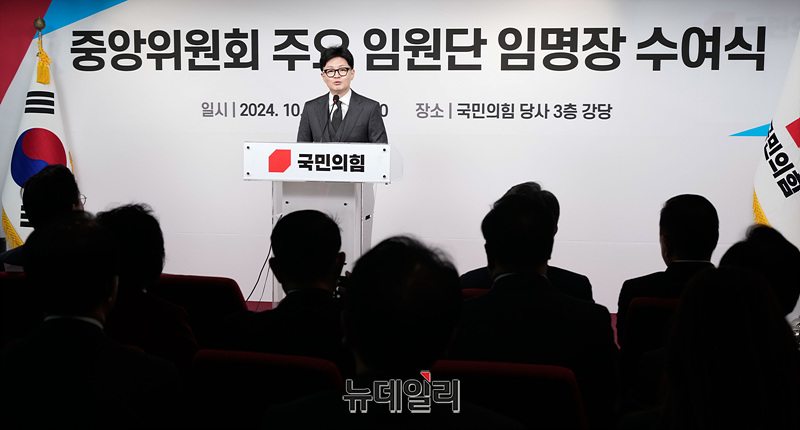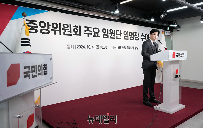 한동훈 국민의힘 대표가 4일 오전 서울 여의도 중앙당사에서 열린 중앙위원회 주요 임원단 임명장 수여식에서 인사말을 하고 있다.