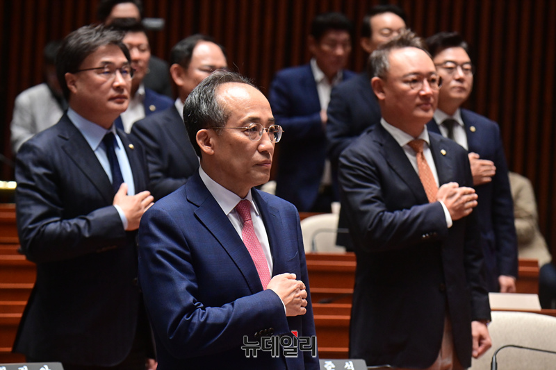 [포토] 국민의례 하는 한동훈 국민의힘 대표
