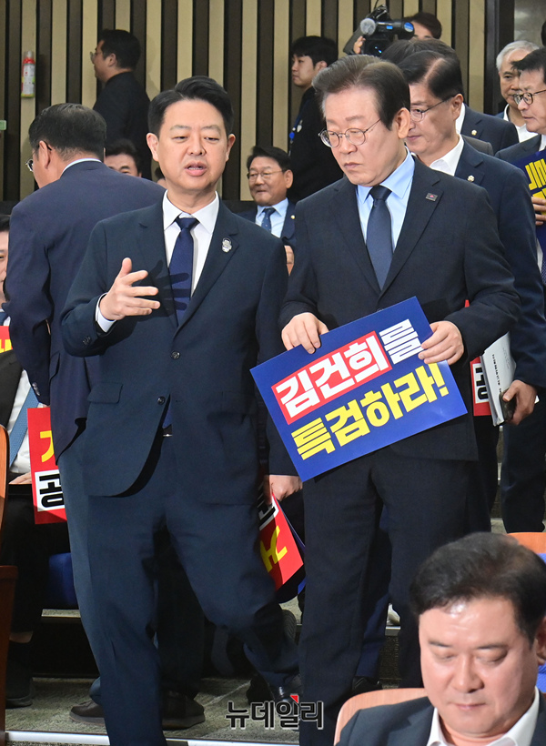 이재명 더불어민주당 대표가 4일 오전 국회에서 열린 의원총회에 참석하며 김영호 의원과 대화를 나누고 있다.