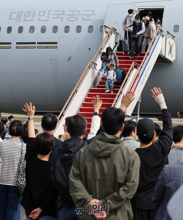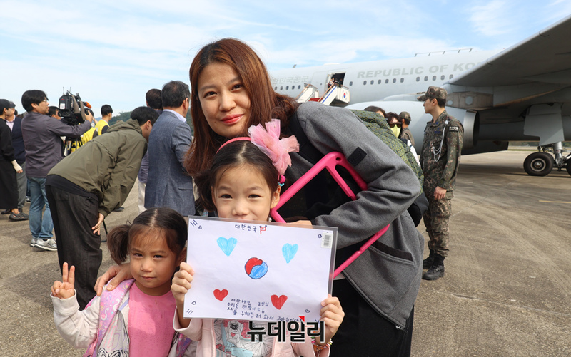 김선호 국방부 차관과 강인선 외교부 2차관이 5일 오후 경기 성남시 서울공항에서 레바논에 체류 중이던 재외국민과 가족을 무사 귀국시킨 외교부 신속대응팀, 군 의무요원을 격려하며 기념촬영을 하고 있다. 이날 레바논에 체류 중이던 재외국민과 가족 97명이 귀국했다. (사진=공동취재단)