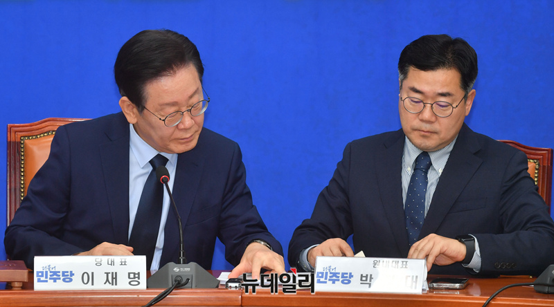이재명 더불어민주당 대표가 7일 오전 국회에서 열린 최고위원회의에서 박찬대 원내대표와 대화를 나누고 있다.
