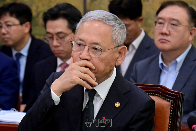 유인촌 문화체육관광부 장관이 7일 국회에서 열린 문화체육관광위원회의 문화체육관광부 국정감사에서 안경을 고쳐쓰고 있다.