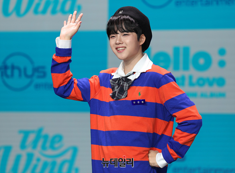 아이돌그룹 더윈드(The Wind) 안찬원이 7일 오후 서울 강남구 일지아트홀에서 열린 세번째 미니앨범 '헬로우:마이 퍼스트 러브' 쇼케이스에서 포즈를 취하고 있다.