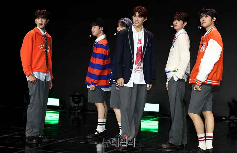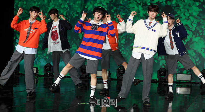 아이돌그룹 더윈드(The Wind)가 7일 오후 서울 강남구 일지아트홀에서 열린 세번째 미니앨범 '헬로우:마이 퍼스트 러브' 쇼케이스에서 타이틀곡 무대를 선보이고 있다.