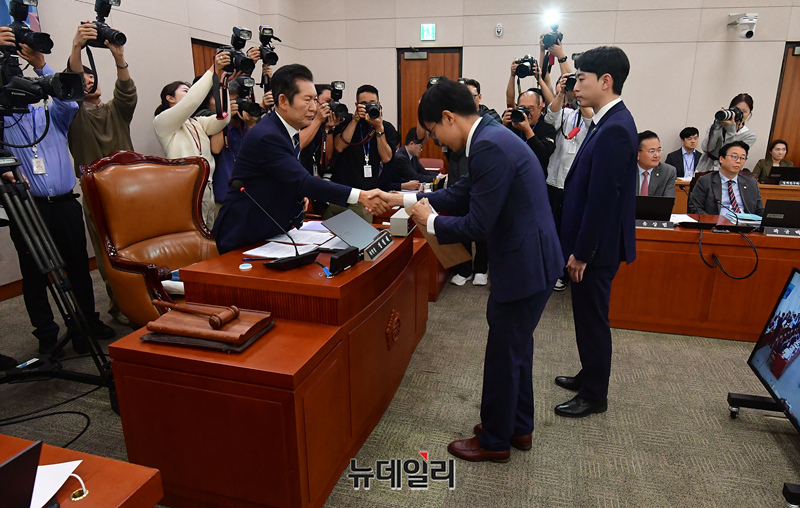 정청래 법제사법위원회 위원장이 8일 오전 국회에서 열린 법무부, 대한법률구조공단, 한국법무보호복지공단, 정부법무공단 국정감사를 앞두고 김영철 서울북부지검 차장검사에 대한 동행명령장을 경위들에게 전달하고 있다.