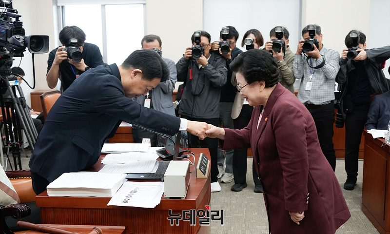 이배용 국가교육위원회 위원장이 8일 오전 서울 여의도 국회에서 열린 국회 교육위원회의 교육부, 국가교육위원회 등에 대한 국정감사에서 증인선서문을 전달하고 있다.