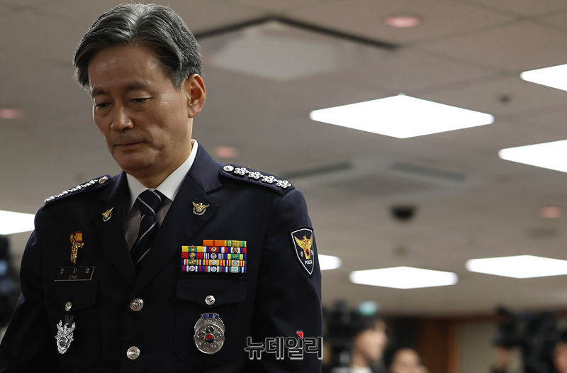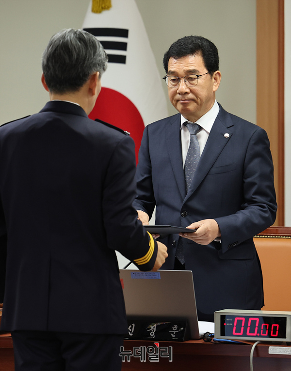 조지호 경찰청장이 11일 오전 서울 서대문구 경찰청에서 열린 국회 행정안전위원회의 경찰청 국정감사에 앞서 선서문을 신정훈 행안위원장에게 전달하고 있다.