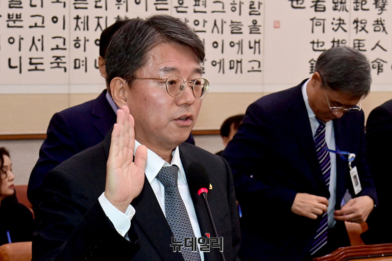 김정원 헌법재판소 사무처장이 11일 오전 국회에서 열린 법제사법위원회 헌법재판소 사무처와 헌법재판연구원에 대한 국정감사에서 선서를 하고 있다.