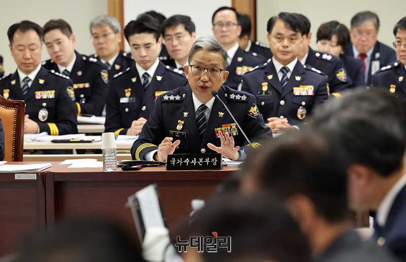 우종수 경찰청 국가수사본부장이 11일 오전 서울 서대문구 경찰청에서 열린 국회 행정안전위원회의 경찰청에 대한 국정감사에서 답변을 하고 있다.