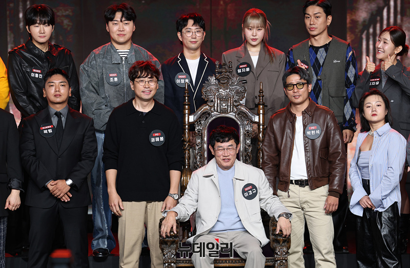 개그맨 이경규를 비롯한 출연 개그맨과 권해봄, 박현석 PD가 14일 오전 서울 중구 동대문 브이스페이스에서 열린 넷플릭스 예능 '코미디 리벤지' 제작발표회에서 기념촬영을 하고 있다.