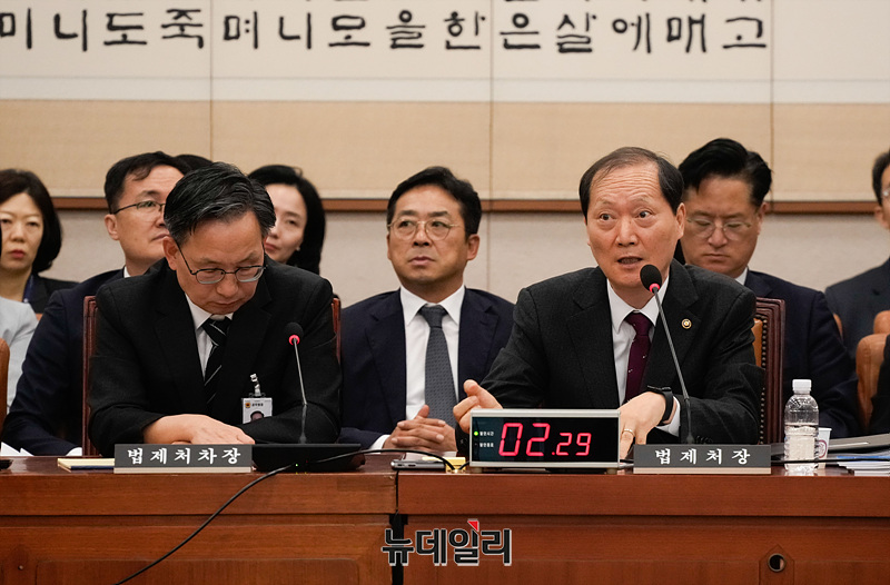 이완규 법제처장이 14일 오전 서울 여의도 국회에서 열린 국회 법제사법위원회의 법제처에 대한 국정감사에서 의원들의 질의에 답하고 있다.