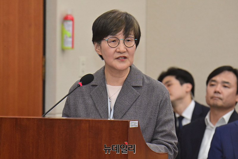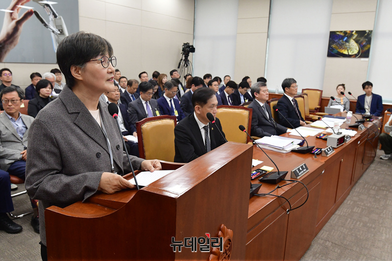 권태선 방송문화진흥회 이사장이 14일 오후 국회 과학기술정보방송통신위원회에서 열린 한국방송공사(KBS)·한국교육방송공사(EBS)·방송문화진흥회에 대한 국정감사에서 인사말을 하고 있다.