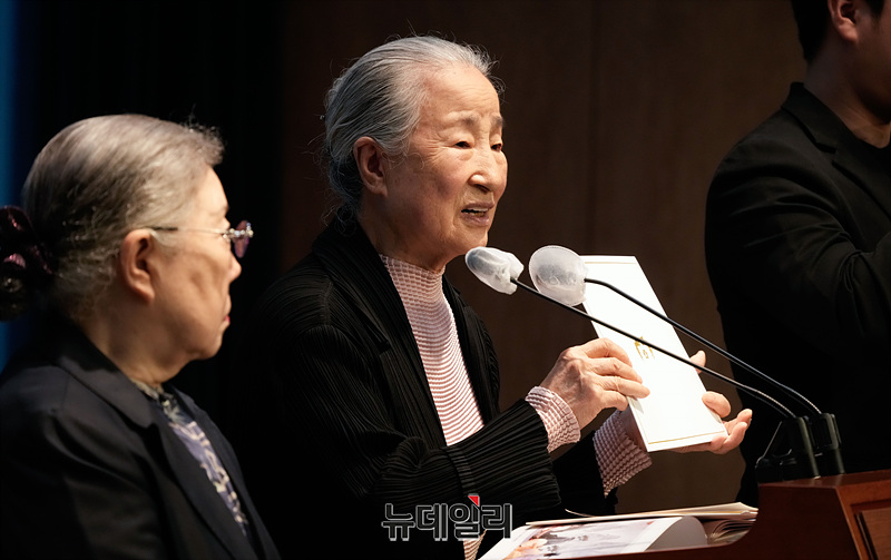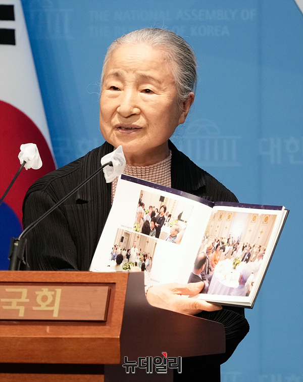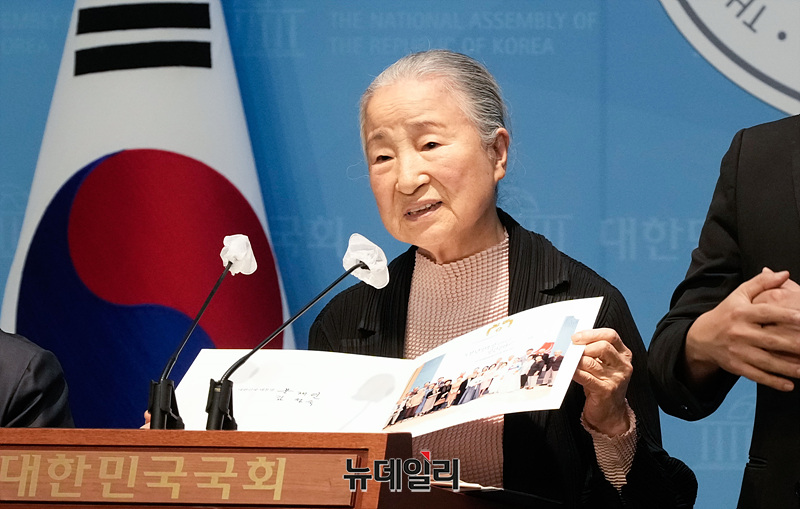 국가무형문화재 이영희 명인이 14일 오후 서울 여의도 국회 소통관에서 '기생집' 발언을 한 양문석 더불어민주당 의원 규탄 기자회견에서 사과를 촉구하고 있다.