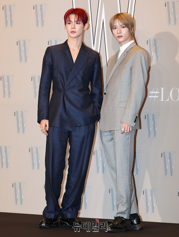 그룹 투모로우바이투게더 연준과 범규가 14일 오후 서울 종로구 포시즌스 호텔 서울에서 열린 더블유 코리아 제19회 유방암 인식 향상 캠페인 자선 행사에서 기념촬영을 하고 있다.