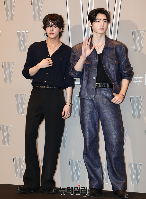 그룹 엔하이픈 제이크와 성훈이 14일 오후 서울 종로구 포시즌스 호텔 서울에서 열린 더블유 코리아 제19회 유방암 인식 향상 캠페인 자선 행사에서 기념촬영을 하고 있다.