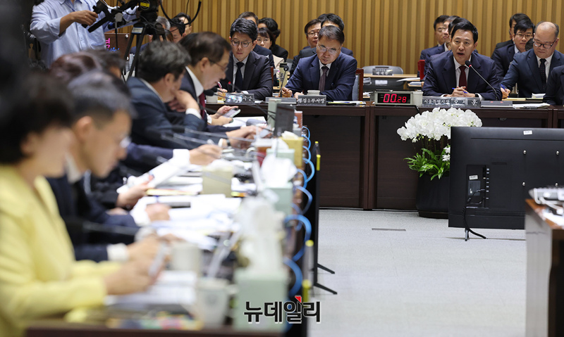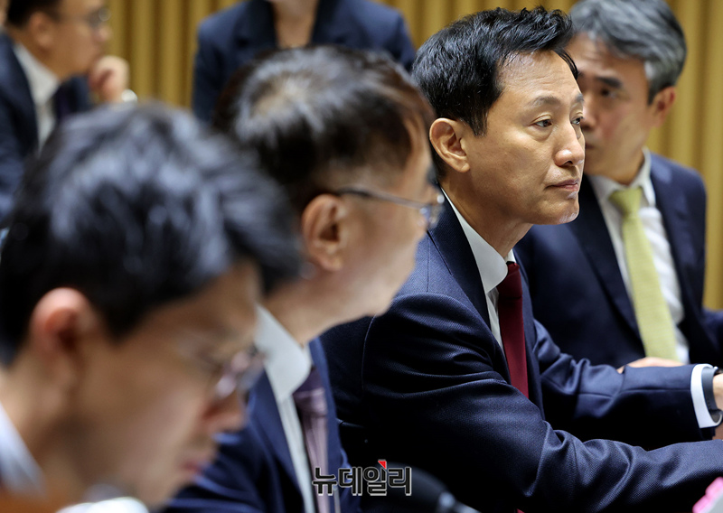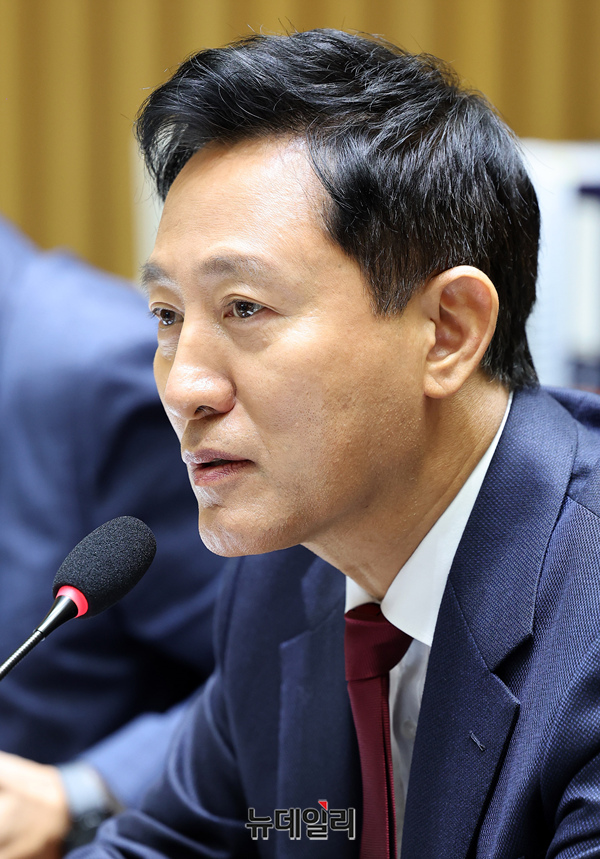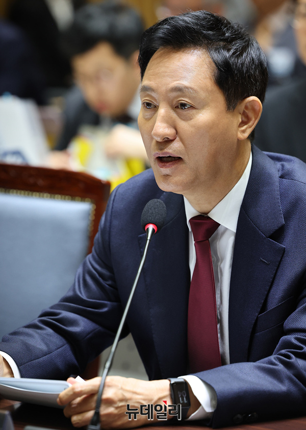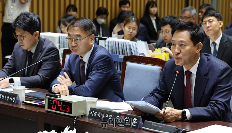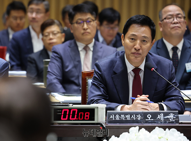 오세훈 서울시장이 15일 오전 서울시청에서 열린 국회 행정안전위원회의 서울특별시에 대한 국정감사에서 질의에 답하고 있다.