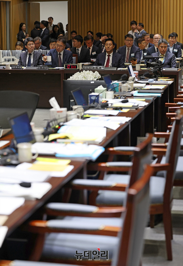 오세훈 서울시장이 15일 오전 서울시청에서 열린 국회 행정안전위원회의 서울특별시에 대한 국정감사에서 의원들의 고성으로 감사가 정회되자 자리를 지키고 있다.