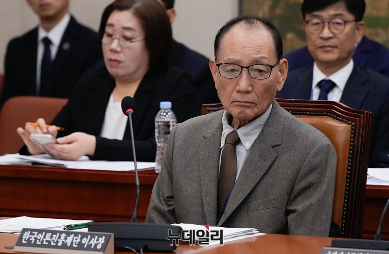 김효재 한국언론진흥재단 이사장이 15일 오전 서울 여의도 국회에서 열린 국회 문화체육관광위원회의 문화체육관광부 산하 공공기관 및 유관기관에 대한 국정감사에 출석해 자리하고 있다.