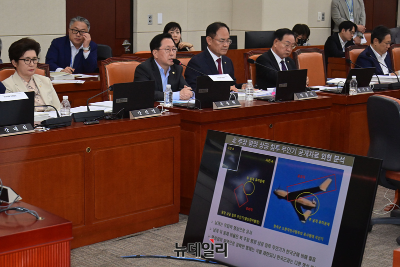유용원 국민의힘 의원이 15일 오전 국회에서 열린 국방위원회의 방위사업청 등에 대한 국정감사에서 무인기 관련 질의를 하고 있다.