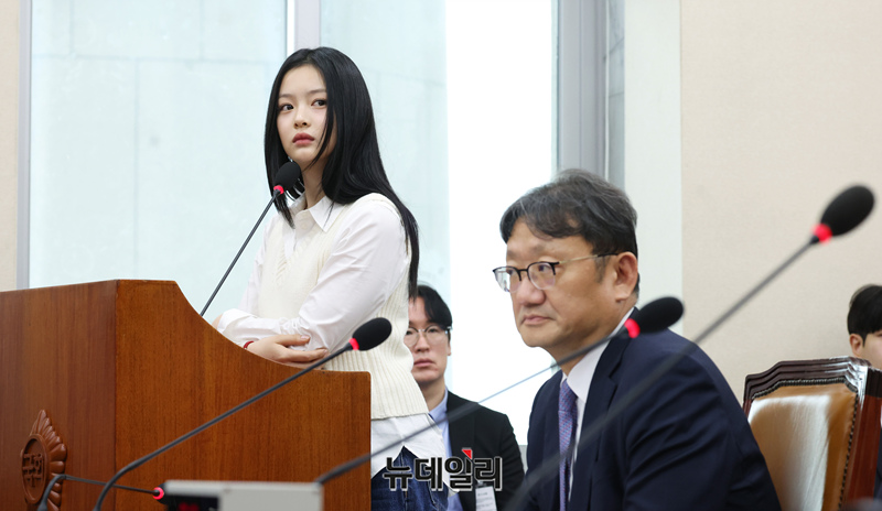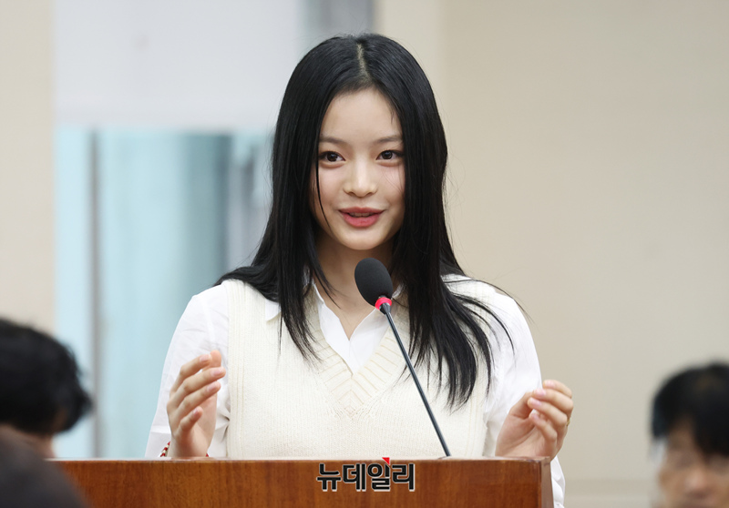 그룹 뉴진스(NewJeans) 하니가 15일 오후 국회 환경노동위원회에서 열린 국정감사에 참고인으로 출석 의원들의 질의에 답하고 있다.